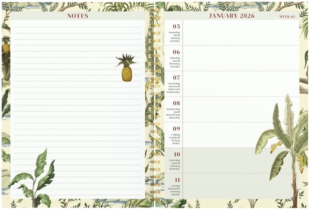 Met deze stijlvolle Botanic wire-o bureau agenda, hou je al je afspraken overzichtelijk bij de hand, en heb je dankzij het grotere formaat plaats genoeg om alles te noteren! Dankzij de wire-o ligt deze agenda mooi open en kan je makkelijk op beide pagina's schrijven. Binnenin vind je full coulour pagina's, met telkens 7 dagen op 2 pagina's, een jaar- en maandplanner en ruimte voor nota's. Het binnenwerk is in het Nederlands, Frans, Duits en Engels. De flexibele kaft heeft een matte finish, en de agenda is voorzien van een glitter-gouden elastische sluiting om alles op zijn plek te houden.