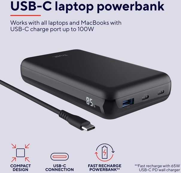 100W-powerbank met hoge capaciteit waarmee je je laptop of MacBook met USB-C snel kunt opladen onderweg. Geef je laptop en de aarde een boost met de Laro 100W Laptop Powerbank. Deze snel ladende powerbank is duurzaam ontworpen met 50% gerecycled plastic en verdubbelt de batterijduur van je laptop. En je kunt wel drie apparaten tegelijk opladen via de twee USB-C-poorten en één USB-A-poort.