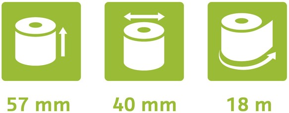 Afmetingen van de rol: breedte 57mm, diameter 40mm, lengte (+/- 2m) 18m.