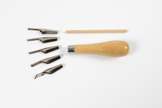 Linoleummessen met verschillende vormen en lengtes die in een houten handgreep worden gestoken. Meestal gebruikt om een ontwerp uit te snijden in een drukblok van linoleum of rubber. De messen zijn eenvoudig aan te brengen en uit te nemen uit de houten handgreep. Steek het uiteinde van het mes in de houten handgreep, vervolgens het houten stokje en druk daarna lichtjes om het mes vast te zetten. Neem het mes uit door het houten stokje opnieuw in te drukken en vervolgens naar buiten te trekken. Als u een houten handgreep voor meer dan één mes wilt, kunt u deze afzonderlijk kopen. Zorg er altijd voor dat u van zich af snijdt, want de messen kunnen bijzonder scherp zijn..
