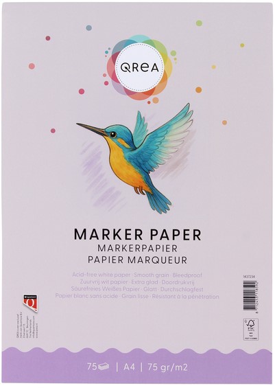 Markerblok Qrea A4 – 75 vel Het Qrea markerblok is speciaal ontwikkeld voor het nauwkeurig tekenen en inkleuren met markers. Dit A4-blok bevat maar liefst 75 vellen (150 pagina's) van 75 grams optisch wit papier dat ideaal is voor (manga)tekeningen, schetsen en illustraties. Het papier is dun genoeg om onderliggende voorbeelden zichtbaar te houden, maar stevig genoeg om doordrukken van inkt te voorkomen. Markerinkt loopt niet uit of door, waardoor je strakke lijnen en nette kleurvlakken creëert. Ook het opbouwen van kleuren in lagen resulteert in mooie, vloeiende overgangen. Geschikt voor onder andere Copic- en Letrasetmarkers. FSC-gecertificeerd en geproduceerd in Duitsland. Kenmerken: