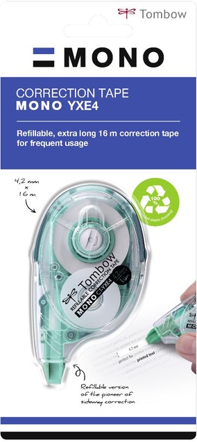 De tape hecht goed op papier en laat niet gemakkelijk los bij overschrijven. Het heeft een controlesysteem om losse tape indien nodig strak te trekken. MONO YXE heeft geen droogtijd en kan direct en schoon worden overschreven. Geen kopie- of faxschaduwen. Behuizing gemaakt van 100% gerecycled plastic. Eenvoudig navulbaar.