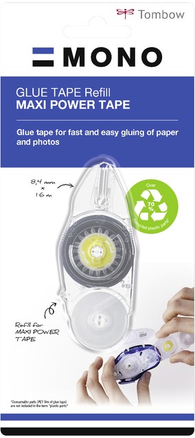 De MONO maxi power tape is een navulbare lijmtape voor eenvoudig, snel en rimpelvrij lijmen. Met extra sterke, permanente lijm en een extra lange tape van 16 meter. Dankzij de unieke technologie wordt de lijm altijd exact op de punt van de roller aangebracht – voor nauwkeurig lijmen van randen en hoeken. De MONO maxi power tape is perfect voor sterk en schoon lijmen van papier, karton, foto’s en meer. Zuurvrij en fotoveilig. Voorzien van een beschermkap. Behuizing gemaakt van 100% gerecycled plastic (PN-IP). Bekroond met de iF Product Design Award 2015. Eenvoudig navulbaar. Tape: 8.4mmx16m. Navulling: PR-IP (kunststof onderdelen gemaakt van meer dan 70% gerecycled materiaal).