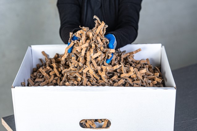 Productie van kartonchips als verpakkings- en vulmateriaal. De kartonnen chips stabiliseren de goederen in de verpakking, vullen leegtes op en vangen schokken op – en dat allemaal zonder plastic.