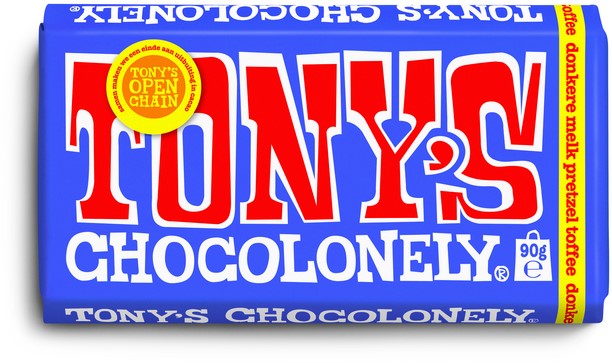 Chocolade Tony's Chocolonely donkere melk pretzel toffee reep 90 gram