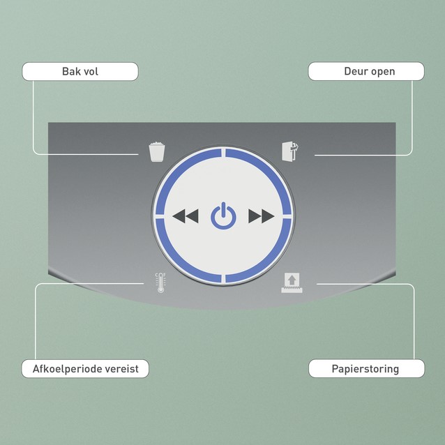 Intuïtief LED-display met waarschuwingsaanduidingen voor volle opvangbak, deur open, oververhitting en overbelasting.