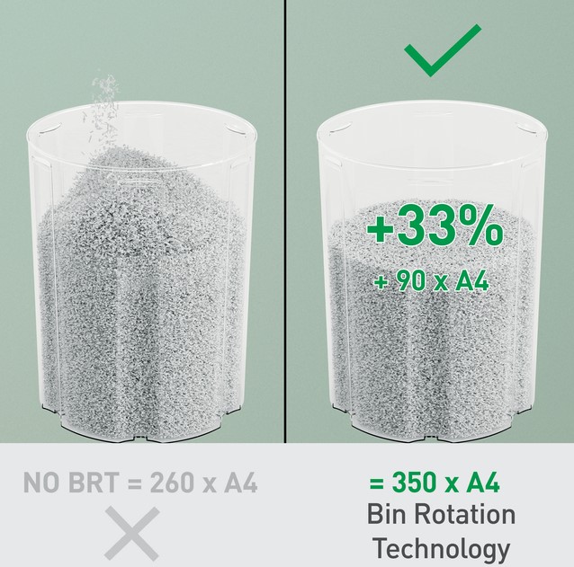De ruime opvangbak van 22 liter kan tot 350x A4-vellen bevatten voordat hij geleegd moet worden; +33% meer capaciteit vergeleken met geen BRT (+90 x A4-vellen).