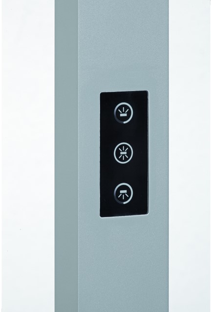 Mobiliteit ; kop, De schakelaar zit op een vaste positie aan de zuil Zware, massieve stalen voet, 50 x 22,5 cm. Staat niet in de weg, de uitgesneden vlakke voetplaat kan om of onder een tafelpoot heen worden geplaatst. Hoogte: 195,5 cm.