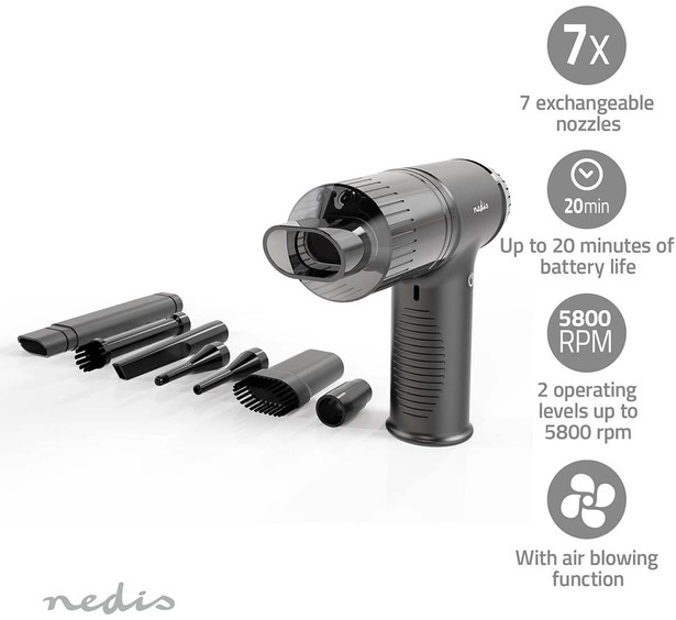 De multifunctionele draadloze stofzuiger en luchtblazer van Nedis is ideaal voor het contactloos reinigen van pc-accessoires en andere elektronische apparaten. Kan worden gebruikt als krachtig alternatief voor perslucht uit blik. Daarnaast kan hij ook worden gebruikt voor huishoudelijke reiniging en autoreiniging.