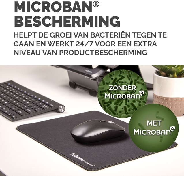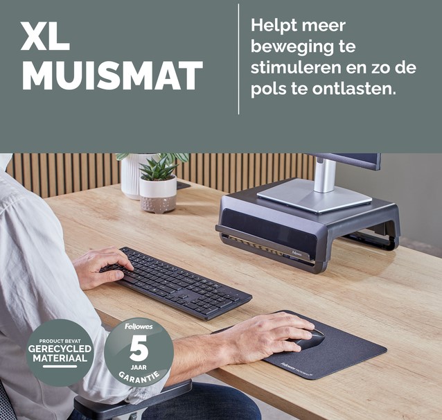 Meer dan 25% groter dan onze standaard muismatten voor meer bewegingsvrijheid, waardoor kleine herhaalde bewegingen die pijn in de pols kunnen veroorzaken, worden verminderd. Bescherm uw bureaublad en verbeter de prestaties van uw muis met deze muismatten die geschikt zijn voor optische en lasermuizen. De ingebouwde Microban®-bescherming helpt de groei van bacteriën te voorkomen en werkt 24/7 voor een extra bescherming van het product. Gemaakt van 83% gerecycled materiaal. De antislipbasis houdt de muismat de hele dag op zijn plaats. Duurzame platte stiksels voorkomen rafelen. Gemaakt om lang mee te gaan, met 5 jaar garantie.