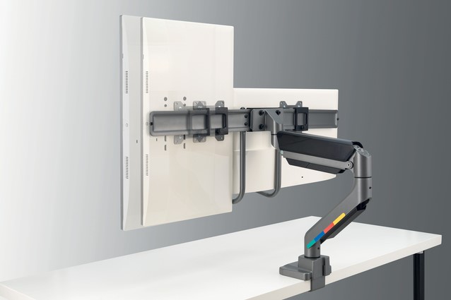 De SmartFit™ Dubbele Monitorarm met Dwarsbalk en Handgreep is een ideale oplossing voor gedeelde werkplekken. De monitorarm maakt gebruik van gasveertechnologie om moeiteloze ergonomische controle te bieden voor een dual-monitoropstelling. Het is heel eenvoudig om de perfecte kijkhoek te creëren met de afzonderlijke hoogte-aanpassing voor elke monitor.