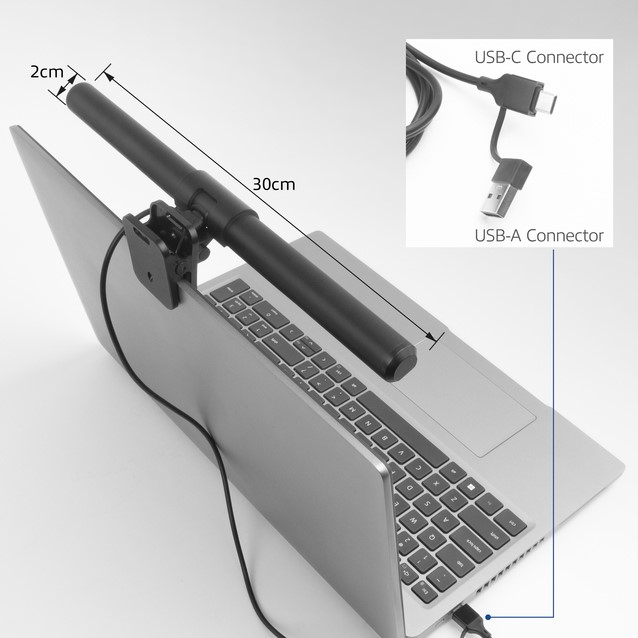 De AC8050 clip-on ledlamp is ontworpen om je laptop extra te verlichten, waardoor je meer comfort en productiviteit hebt tijdens het werken in situaties met weinig licht. De ledlamp wordt gevoed via USB en heeft drie verschillende kleurtemperaturen: warm wit (3000K), daglicht (5000K) en koel daglicht (6500K). Daarnaast is de helderheid van het licht ook nog aan te passen zodat je de ledlamp helemaal naar eigen wens kunt instellen. Verlicht je toetsenbord voor meer kijkcomfort. De AC8050 helpt je om beter geconcentreerd te kunnen werken op je laptop in situaties met weinig licht. De ledlamp is eenvoudig op je laptop te bevestigen en eraf te halen door het clip-on ontwerp. Bediening via touch. Met de touch-knop op de zijkant van de lamp kun je de helderheid en kleurtemperatuur met een lichte aanraking aanpassen. De ledlamp heeft drie verschillende kleurtemperaturen: warm wit (3000K), daglicht (5000K) en koel daglicht (6500K). Voor het aanpassen van de helderheid hoef je alleen maar op de zijkant te tikken en dit even vast te houden. Ontwerp met klem en webcam-uitsparing. Bevestig de ledlamp gemakkelijk en stevig op je laptop met het klemsysteem. De klem heeft beschermende antislip pads die de lamp op de plek houden. Daarnaast blijft de ingebouwde webcam van de laptop gewoon bruikbaar doordat er een handige uitsparing in de klem zit. Voeding via USB. De AC8050 led lichtbalk wordt gevoed via USB. Een USB-kabel van 120cm wordt meegeleverd en is te gebruiken met zowel USB Type-A als USB Type-C apparaten zoals een laptop, USB-lader of powerbank.