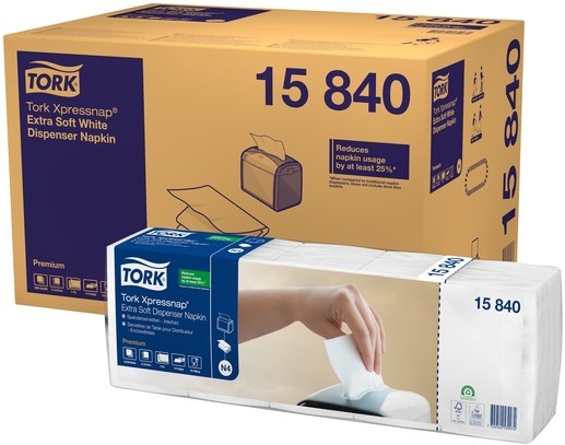 Tork Xpressnap® Extra Zachte Dispenserservet Wit N4: Drukbezochte zelfbedieningsruimten vragen om hoogwaardige papieren servetten die geen onnodige kosten en afval creëren. Onze Xpressnap® Extra Zachte Dispenserservetten zijn zacht en dik en maken een blijvende indruk op gasten. Ze zijn te gebruiken met al onze Xpressnap® dispensers, die de hygiëne verbeteren omdat gasten alleen hun eigen servet aanraken. De één-per-keer-dosering bespaart bovendien kosten, doordat 25% minder servetten wordt verbruikt dan met traditionele servettendispensers. De voordelen op een rijtje: