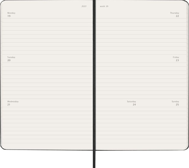 De Moleskine Horizontal Weekly Planner is gedateerd van januari tot december. Deze populaire planner is ingedeeld in een horizontaal formaat om elke week op twee pagina's te laten zien (maandag t/m woensdag aan de linkerkant, donderdag t/m zondag aan de rechterkant). De planner heeft afgeronde hoeken en een elastische sluiting. Gevuld met prachtige, ivoorkleurige pagina's, met genoeg ruimte voor uw eigen inbreng evenals handige tools. - Harde of Zachte kaft - Afgeronde hoeken - Elastische sluiting - Moleskine ivoorkleurig papier - Papiergewicht: 70 g/m² - Handige tools: planning, tijdzones, internationale metingen, toegangscodes en vluchtduur - Wereldwijde feestdagenkalender verkrijgbaar via moleskine.com/diaryaddons - Uitbreidbaar binnenvak passend bij de kleur van het notebook - "In geval van verlies" label gedrukt op het schutblad - Bijpassende bladwijzer voor lint - Herbruikbare paperband B-SIDE met extra gedrukte tools - 180° liggende opening - Moleskine srl. creëert en verkoopt FSC-gecertificeerde producten