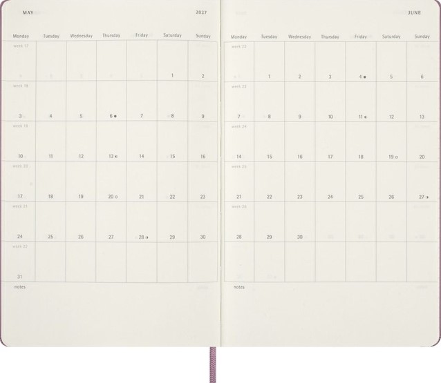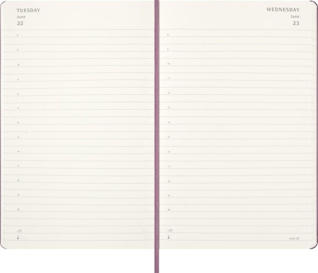 De Moleskine Daily Planner is gedateerd van januari tot december. Deze populaire planner is ontworpen met elke dag op een afzonderlijke pagina en heeft een prachtige roze kleur om stijlvol het jaar in detail vast te leggen. De planner heeft een harde of zachte kaft met afgeronde hoeken en een elastische sluiting. - Harde of Zachte kaft - Afgeronde hoeken - Elastische sluiting - Moleskine ivoorkleurig papier - Papiergewicht: 70 g/m² - Handige tools: planning, tijdzones, internationale metingen, toegangscodes en vluchtduur - Wereldwijde feestdagenkalender verkrijgbaar via moleskine.com/diaryaddons - Uitbreidbaar binnenvak passend bij de kleur van het notebook - "In geval van verlies" label gedrukt op het schutblad - Bijpassende bladwijzer voor lint - Herbruikbare paperband B-SIDE met extra gedrukte tools - 180° liggende opening - Moleskine srl. creëert en verkoopt FSC-gecertificeerde producten