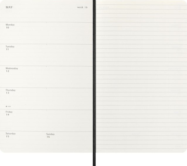 De Moleskine Weekly Notebook Planner is gedateerd van januari tot december. Het is een handige en veelzijdige planner die de vrijheid van een notitieboekje bevat en is ingedeeld met de afspraken van de week aan de linkerkant en een gelinieerde pagina voor notities op de rechter bladzijde. Het notitieboekje is beschikbaar met een harde of een zachte kaft met afgeronde hoeken en een elastische sluiting. - Harde of Zachte kaft - Afgeronde hoeken - Elastische sluiting - Moleskine ivoorkleurig papier - Papiergewicht: 70 g/m² - Handige tools: planning, tijdzones, internationale metingen, toegangscodes en vluchtduur - Uitbreidbaar binnenvak passend bij de kleur van het notebook - "In geval van verlies" label gedrukt op het schutblad - Bijpassende bladwijzer voor lint - Herbruikbare paperband B-SIDE met extra gedrukte tools - 180° liggende opening - Moleskine srl. creëert en verkoopt FSC-gecertificeerde producten