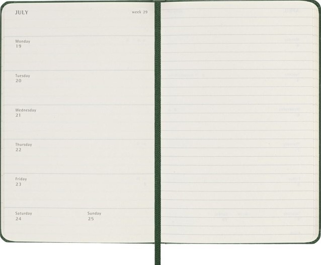 De Moleskine Weekly Notebook Planner is gedateerd van januari tot december. Het is een handige en veelzijdige planner die de vrijheid van een notitieboekje bevat en is ingedeeld met de afspraken van de week aan de linkerkant en een gelinieerde pagina voor notities op de rechter bladzijde. Het notitieboekje is beschikbaar met een harde of een zachte kaft met afgeronde hoeken en een elastische sluiting. - Harde of Zachte kaft - Afgeronde hoeken - Elastische sluiting - Moleskine ivoorkleurig papier - Papiergewicht: 70 g/m² - Handige tools: planning, tijdzones, internationale metingen, toegangscodes en vluchtduur - Uitbreidbaar binnenvak passend bij de kleur van het notebook - "In geval van verlies" label gedrukt op het schutblad - Bijpassende bladwijzer voor lint - Herbruikbare paperband B-SIDE met extra gedrukte tools - 180° liggende opening - Moleskine srl. creëert en verkoopt FSC-gecertificeerde producten