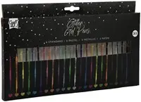 Set van 24 mooie glittergelpennen, geschikt om mee te schrijven en tekenen. Met mooie, heldere kleuren waaronder blauw, paars, groen en rood. Inclusief 1 zilverkleurige en 1 goudkleurige gelpen.