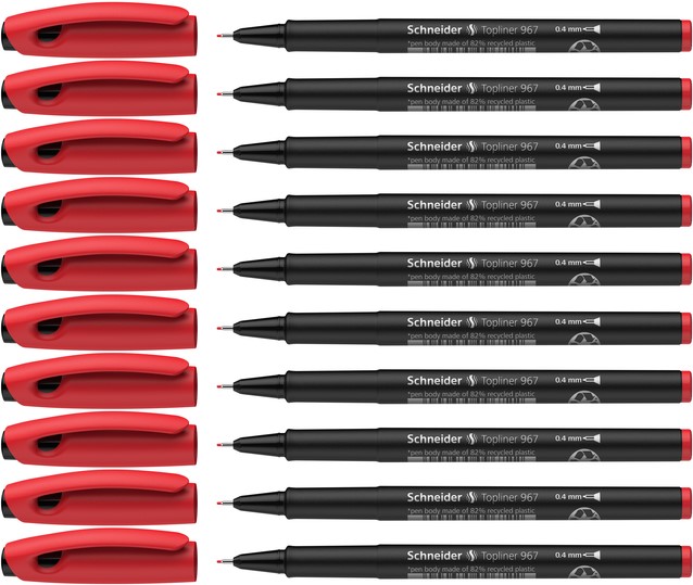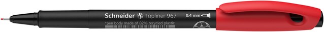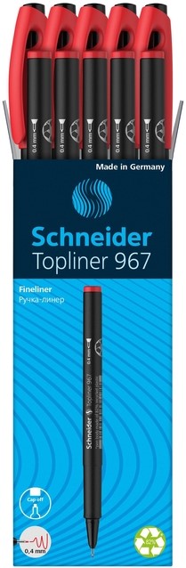 Fineliner Topliner 967 heeft een robuuste schrijfpunt in metalen omhulsel. Hierdoor is deze pen geschikt voor het gebruik van linialen en sjablonen. De cap-off inkt is op waterbasis en droogt niet uit, zelfs niet als de dop 2-3 dagen eraf ligt. Inkt bevat conserveermiddel C(M)IT/MIT waardoor langer houdbaar. De schrijfkleur is herkenbaar aan de dop en uiteinde van de pen. De behuizing bestaat uit mat zwart metallic en is gemaakt van PP voor lange houdbaarheid